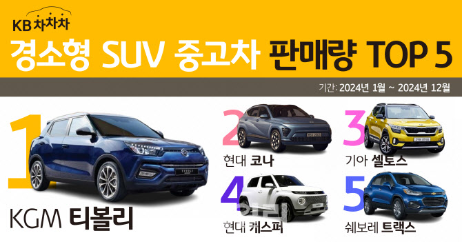 판매량 1위는 KG모빌리티 티볼리였고 2위부터 5위까지는 현대 코나, 기아 셀토스, 현대 캐스퍼, 쉐보레 트랙스 순으로 나타났다. 1위를 차지한 티볼리는 2위인 코나에 비해 86.1% 높은 판매량을 기록했다. 2위 코나와 3위 캐스퍼가 7.8% 차이를 보인 것에 비해 상대적으로 큰 격차로 1위를 달성했다. 티볼리는 소형 SUV의 본격적인 대중화를 이끈 모델로 차체 뒷 부분을 늘려 내부 공간을 효과적으로 확장한 모델이다. 2023년 6월 부분 변경되며 신차 시장에서도 활발히 활약 중이다.