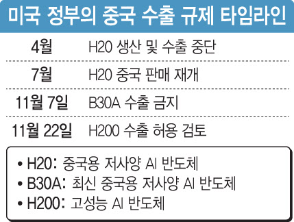 엔비디아가 지난해 출시한 H200은 현재 중국에 수출하고 있는 H20 성능의 두 배에 달한다. H20은 미국의 수출 규제를 피하기 위해 엔비디아가 중국용으로 만든 저사양 AI 반도체다. 이에 반해 H200은 지난 세대 아키텍처인 ‘호퍼’를 적용한 AI 반도체 중 가장 높은 성능을 보인다. 엔비디아의 최신 제품인 ‘블랙웰’보다는 성능이 다소 뒤처지지만 H20과 비교하면 한 세대 높다.