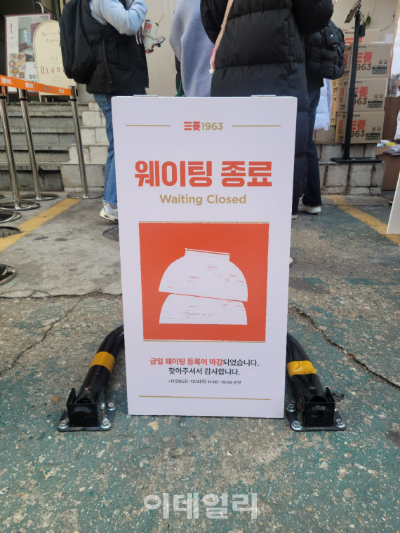 2일 오후 12시40분께 찾은 성수동 삼양식품 ‘삼양1963’ 팝업스토어(임시매장) 현장. 성수역 3번 출구에서 도보로 5분 거리에 있는 임시매장 정문은 영하에 가까운 추운 날씨에도 30여명 사람들로 북적였다. 김씨처럼 사전에 대기번호를 받았다가 차례가 돼 텀블러에 든 삼양1963 라면을 받으러 왔거나 이제 막 현장을 찾아 대기번호를 누르러 온 이들, 아예 네이버 사전 예약으로 매장 안에 들어가 삼양1963 라면을 시식할 방문자들이 뒤섞여 줄을 이뤘다.
