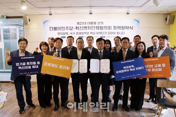 이날 더불어민주당과 혁단협은 혁신벤처생태계를 활성화하기 위한 핵심 정책 과제로 △벤처 정책을 경제 정책의 핵심 아젠다로 설정 △연기금 투자풀 활용 등 혁신 금융 확대 방안 마련 △벤처기업 혁신 성장을 위한 근로 제도 합리화 △신산업 발굴과 혁신의 기회 확장을 위한 규제 합리화 등을 제21대 대선의 핵심 과제로 선정하고 협약을 체결했다.