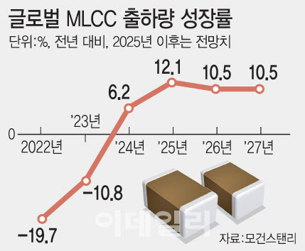 4일 글로벌 투자은행(IB) 모건스탠리에 따르면 올해 글로벌 MLCC 출하량은 전년 대비 12.1% 급증할 것으로 추정된다. 내년(10.5%), 오는 2027년(10.5%) 모두 10%대 고성장을 이어갈 것이라는 게 모건스탠리의 전망이다. 지난 2022년, 2023년 당시 마이너스 성장을 했던 것과 비교하면 업황이 확연히 달라진 것이다.