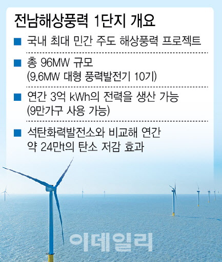 전남해상풍력 1단지는 전남 신안군 자은도 연안으로부터 북서쪽으로 약 9km 떨어진 공유수면에 조성된 고정식 해상풍력 발전단지다. 총 96메가와트(MW) 규모로 민간이 주도한 국내 해상풍력 프로젝트 중 최대 규모다. 9.6MW 규모의 대형 풍력발전기 10기가 설치돼 있으며, 연간 약 3억 kWh의 전력을 생산할 수 있다. 이는 국내 가구 평균 기준 약 9만 가구가 1년 동안 사용할 수 있는 규모다. 동일 전력량을 석탄화력발전소로 생산할 경우와 비교해 연간 약 24만 톤의 탄소 저감 효과가 기대된다.