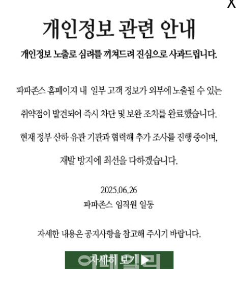 한국파파존스는 “현재 해당 취약점은 즉시 차단 및 보완 조치를 완료해 운영되고 있다”면서 “정부 산하 유관 기관(한국인터넷진흥원 등)과 긴밀히 협력해 정보 노출 범위와 원인에 대해 신속하고 정확하게 조사하고 있다”고 설명했다.