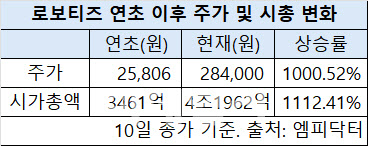 주가 흐름도 이를 반영하는 모습이다. 로보티즈 주가는 최근 한 달간 28.51% 상승해 같은 기간 코스닥 지수 수익률(6.64%)을 훌쩍 웃돌았다. 로보티즈는 연초 2만5806원에서 이날 종가 기준 28만4000원으로 1000% 넘게 상승한 상태다. 같은 기간 시가총액은 3461억원에서 4조1962억원 규모로 12배 가까이 불어났다.