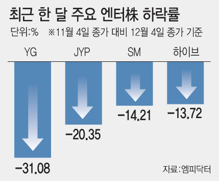 투자 모멘텀 약화도 주가를 짓눌렀다. 아시아·태평양경제협력체(APEC) 정상회의를 계기로 고조됐던 한한령(限韓令) 해제가 현실화되지 않으면서 관련 투자 포인트가 빠르게 식었다. 시장에선 올해 상반기 엔터주에 대한 기대가 주가에 선반영돼 있었다 하더라도 최근 조정은 과도하다는 평가도 나온다.
