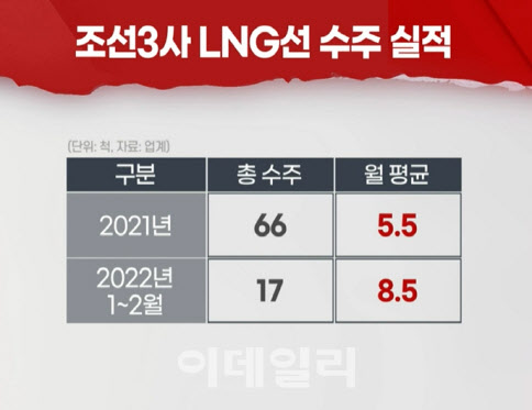 삼성중공업(010140)은 어제(23일) 아프리카 지역 선주로부터 약 1조원 어치 LNG 운반선(총 4척) 공사를 수주했습니다. 이를 포함해 현대중공업(329180), 대우조선해양(042660) 등 국내 조선 빅3가 올들어 따낸 LNG선 공사계약은 총 17척입니다. 작년 한해 LNG선 수주량(66척) 대비 4분의 1을 채웠습니다. 단순 계산시 작년보다 한달 정도 빠른 수주 실적입니다.