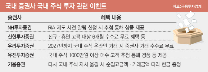 2일 금융투자업계에 따르면 국내 증권사들은 올해 들어 국내 주식 거래 수수료를 한시적으로 낮추거나 면제하는 등의 이벤트를 잇달아 내놓고 있다. 신규 고객은 물론, 한동안 거래가 없던 휴면 고객까지 폭넓게 포함해 국내 증시 복귀 수요를 끌어들이는 방식이다. RIA 제도 도입을 앞두고 사전 신청·알림 신청 등으로 고객 접점을 미리 확보하려는 움직임도 감지된다.