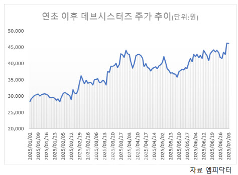 작년 말 52주 신저가(2024년 12월 30일 장중 2만 6950원)를 기록했던 데브시스터즈 주가는 현재 4만 6150원까지 상승, 올 들어서만 66.6% 뛰었다.