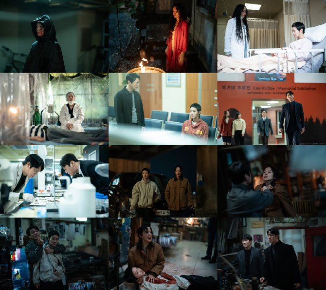 함께 공개된 미공개 스틸에는 ‘윤수’가 ‘모은’이 내건 ‘자백의 대가’를 실행하기 위해 고군분투하는 모습이 담겨 이목을 집중시킨다. 자백을 해주는 대가로 자신이 죽이지 못한 치과 의사 부부의 아들을 대신 죽여달라는 ‘모은’. 살인 혐의를 벗기 위해 살인을 해야 하는 아이러니에 처한 ‘윤수’가 진범을 찾기 위해 필사적으로 움직이는 절박한 모습이 극의 긴장감을 한층 끌어올린다. 의료 봉사 현장에서 공허한 표정으로 앉아 있는 ‘모은’의 스틸은 그가 ‘마녀’로 불리게 될 수밖에 없었던 과거의 상처를 떠올리게 하며 서사에 깊이를 더한다. ‘안윤수’ 남편의 추모 전시회를 찾은 ‘백동훈’(박해수)의 스틸은 그가 그곳에서 발견하게 될 단서와 진범의 실체에 대한 궁금증을 자극한다. 한편, 사건의 진실이 드러나는 순간을 포착한 스틸들도 공개됐다. ‘윤수’와 ‘모은’을 위협하는 ‘진영인’(최영준) 모습으로 마침내 숨겨져 있던 진상이 드러나는 가운데, 피를 흘리며 쓰러진 ‘모은’의 모습은 두 사람의 위험한 거래와 자백의 대가의 실체를 암시한다. 이를 지켜보는 ‘백동훈’과 ‘장정구’(진선규)의 표정 역시 긴박하게 흘러가는 상황을 고스란히 전하며 긴장감을 고조시킨다.
