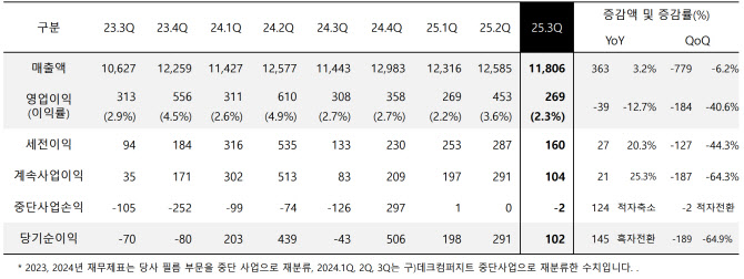 사업별로 살펴보면 산업자재부문은 매출 5933억원, 영업이익 222억원으로 전년 동기 대비 각각 6.1% 증가, 24.7% 감소한 실적을 나타냈다. 자동차 소재·부품과 자회사 실적이 안정적인 흐름을 보였으며 아라미드 사업도 물량 확대를 통해 적자 폭을 줄였다. 타이어코드 사업은 판매 증가세가 이어지고 있다. 회사는 적극적 물량 확보를 통해 가동률 제고와 생산성 향상을 통한 수익성 개선 방안을 추진 중이다.