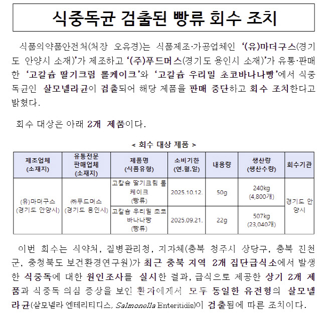 문제가 된 제품은 △고칼슘 딸기크림 롤케이크(50g, 소비기한 10월 12일)와 △고칼슘 우리밀 초코바나나빵(22g, 소비기한 9월 21일)으로, 이들은 식품제조업체 ㈜마더구스가 생산하고 푸드머스가 전국 급식업체에 납품한 제품이다.