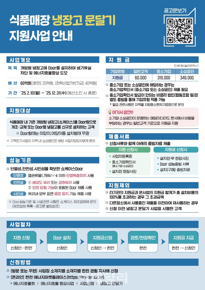 또한 한전은 식품매장의 냉기유실 차단 및 에너지효율향상 도모를 위해 시행하는 ’식품매장 냉장고 문달기‘ 지원도 병행하고 있다. 기존에 문이 달리지 않은 개방형 냉장고에 문을 추가로 달거나, 문이 달린 새 제품으로 바꿀 때 들어간 돈의 40% 수준에서 지원금을 받을 수 있다. 지원금은 설치되는 문 면적 1㎡당 6만원에서 최대 34만 9000원까지이며, 참여사업자의 고객 유형(일반고객, 중소기업, 소상공인)에 따라 차등 적용된다. 이밖에도 한전에서는 뿌리기업, 농어민, 소상공인을 대상으로 고효율기기 교체지원금을 일반고객 대비 1.5배 상향해 지원 중이다.