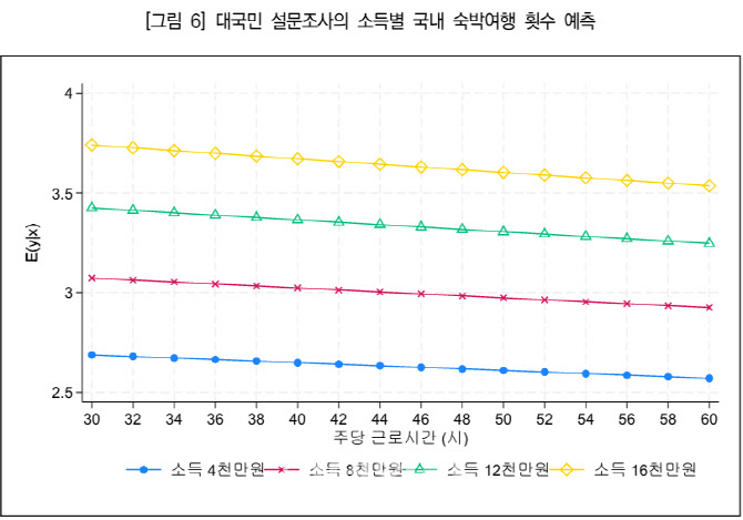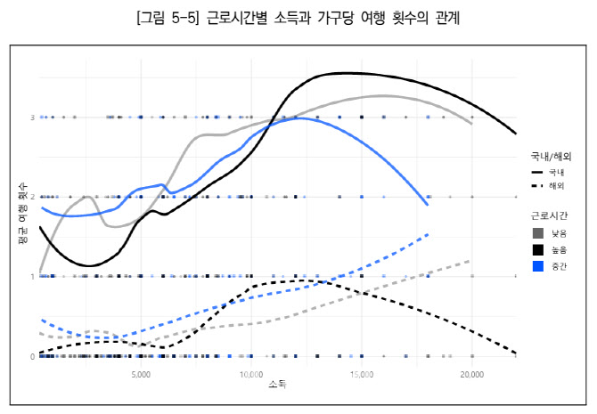 | | 근로시간별 소득과 가구당 여행 횟수의 관계 (사진=한국문화관광연구원 ‘국민 국내관광 심층분석 및 정책 대응방향’ 정책연구) |