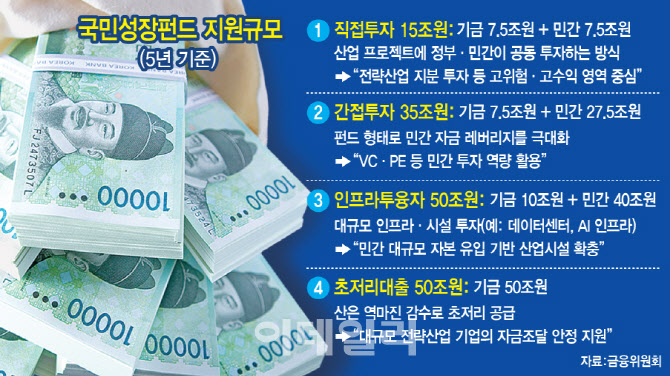 특히 금융위는 국민성장펀드를 5년간 균등하게 집행하기보다 출범 초기에 적극 지원한다는 방침이다. 전략위원회는 개별 건에 대해 투자를 결정하진 않는다. 전문가로 구성된 투자심의위원회가 AI·로봇, 에너지 등 5개 분과로 구분해 1차적으로 실무 심사를 담당한다. 투심위를 거친 건에 대해 9인의 민간 전문가로 꾸려진 기금운용심의회가 기금 투입 여부를 최종 결정하는 구조다. 투자 방식은 직접투자(15조원), 간접투자(35조원), 인프라 투·융자(50조원), 초저리 대출(50조원) 등 크게 네 가지다. 인프라 사업, 지역전용 펀드 등을 활용해 전체의 40% 이상은 지역에 투입하며, 국민참여형 공모펀드도 모집한다.