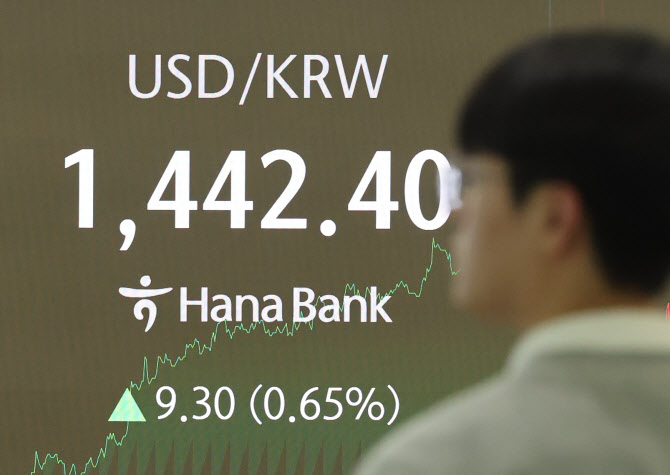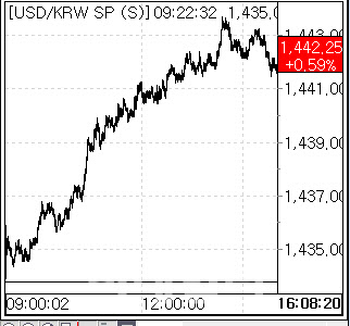 이날 환율은 역외 환율을 반영해 전 거래일 종가보다 3.7원 오른 1436.8원에 개장했다. 전날 새벽 2시 마감가(1433.8원) 기준으로는 3.0원 올랐다. 이날 환율은 우상향 흐름을 그렸다. 개장 이후부터 환율은 상승 폭을 확대하며 오후 12시 이전에 1440원대로 올라섰다. 오후에도 상승세는 꺾이지 않으며 전일 대비 10원 이상 올라 1443.7원을 터치했다.