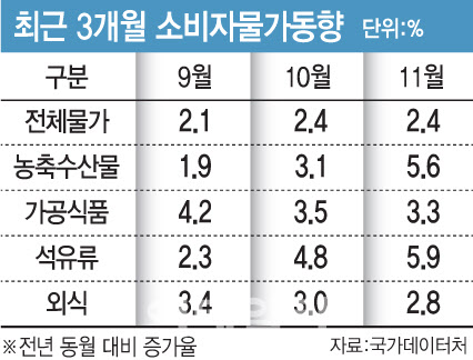 환율에 민감한 석유류가 국제유가 하락에도 고환율 영향으로 전년 대비 5.9% 급등하며 물가 상승세를 견인했다. 농축수산물 가격도 물가를 끌어올렸다. 수급 불균형에 쌀값은 오름세를 이어가며 전년 대비 18.6% 상승했고 가을철 잦은 비의 영향에 귤(26.5%), 사과(21.0%) 등 과일류 가격도 뛰었다.