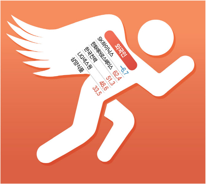 순매수 5위를 차지한 SK텔레콤(017670) 역시 유심(USIM) 정보 해킹 사태에 따른 주가 하락 구간에서 저점 매수한 덕에 10.9%의 수익률을 기록했다.