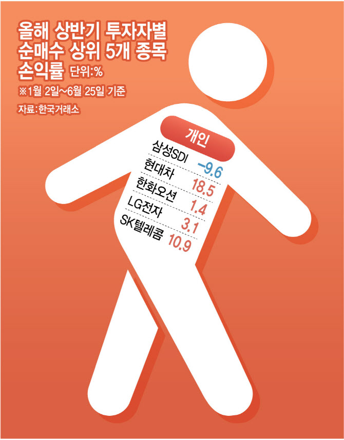 개인투자자는 상반기 순매수 상위 5개 종목 평균 수익률이 4.9%로 선방했지만, 외국인보다는 아쉬운 성적을 나타냈다. 개인투자자는 관세 등의 리스크로 약세를 보인 종목을 저점에서 매수하는 전략을 편 가운데, 절반의 성과를 거뒀다. 우선 순매수 1위 종목인 삼성SDI(006400)에 대한 개인투자자의 평균매수가격은 19만3946원으로 지난 25일 종가(17만5400원) 대비 9.6%의 손실을 본 것으로 집계됐다. 미국의 자동차 관세 부과와 미국 전기차 세액공제 혜택 축소 추진에 투자심리가 악화하며 손실률이 확대된 것으로 풀이된다.