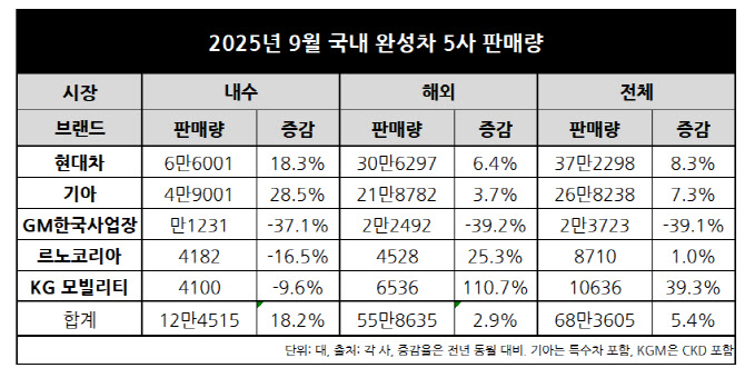 1일 현대차(005380)·기아(000270)·KG모빌리티(003620)(KGM)·한국GM·르노코리아에 따르면 지난달 국내 5개사가 국내외 시장에서 판매한 완성차는 총 68만3605대로 전년 대비 5.4% 증가했다. 기아는 특수차를, KG모빌리티는 현지조립형 반제품(CKD)을 각각 포함한 수치다.
