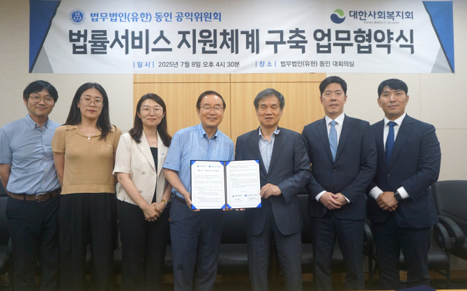 [이데일리 송승현 기자] 법무법인 동인 공익위원회(위원장 이성보 변호사)는 지난 8일 서울 서초동 동인 대회의실에서 사회복지법인 대한사회복지회(회장 강대성)와 ‘법률서비스 지원체계 구축 업무협약식’을 체결했다.