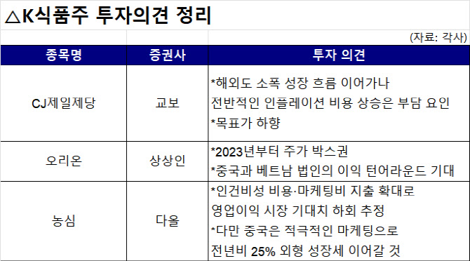 조상훈 신한투자증권 연구원은 “국내 시장의 양적 한계가 명확해진 상황에서 해외 진출은 선택이 아닌 필수”라며 “식품주가 방어주가 아닌 수출 주도주로서의 면모가 부각되는 시점이다. 내수 중심에서 수출 기업으로 변신 중인 기업들에 기회 요인이 많다”고 설명했다.