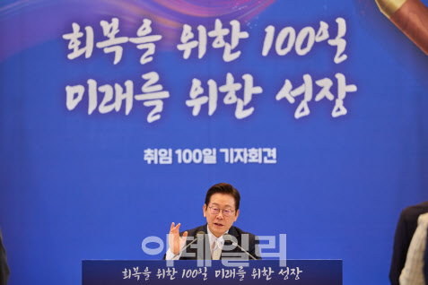 이날 열린 취임 100일 기자회견은 차분한 분위기에서 진행됐다. 출범 한 달 만에 했던 취임 30일 기자회견과 달리, 이 대통령은 최대한 많은 질문을 소화하려 했다. 예정된 시간을 1시간 넘긴 2시간 30분 동안 기자들의 질문을 받았다.