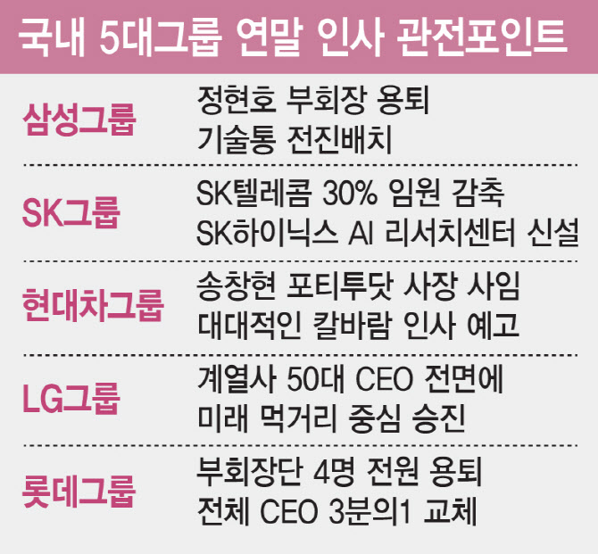 SK그룹뿐만 아니다. 5대 그룹의 올해 주요 인사 키워드는 부회장단 축소다. 삼성전자는 정현호 부회장의 용퇴로 부회장이 2명에서 1명(전영현 부회장)으로 줄었다. 삼성그룹 내 부회장은 전영현 부회장과 최성안 삼성중공업 부회장 등 2명이다. LG그룹은 신학철 LG화학 부회장이 물러나면서 2명에서 1명(권봉석 부회장)으로 감소했다. 롯데그룹은 부회장단 4명이 모두 물러났다.