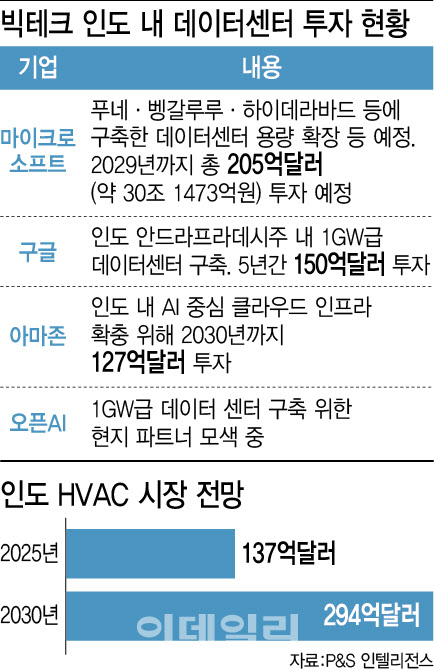 [이데일리 박원주 기자] 최근 마이크로소프트(MS), 구글 등 글로벌 빅테크들이 인도의 정책 지원 등에 힘입어 인도에서 조 단위 인공지능(AI) 데이터센터 투자를 발표하고 있다. 이 같은 인프라 구축에 힘입어 인도 냉난방공조(HVAC) 시장을 공략하고 있는 LG전자가 수혜를 볼 것이라는 기대가 커진다.