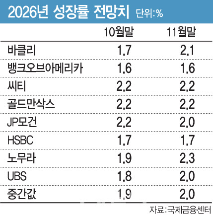 기관별로 보면 노무라가 1.9%에서 2.3%로 한 달 새 0.4%포인트, 바클리는 1.7%에서 2.1%로 성장률 전망치를 올렸다. UBS 역시 1.8%에서 2.0%로 상향 조정했다.