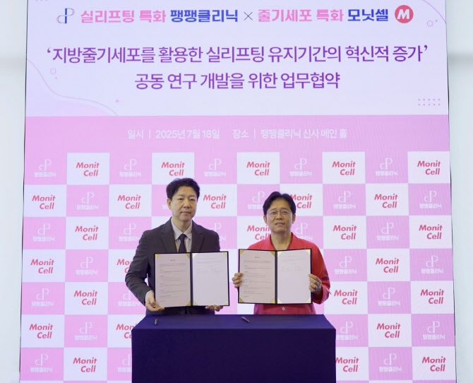 팽팽클리닉(팽팽의원)은 지방줄기세포 연구개발 기업 모닛셀과 함께 실리프팅 유지 기간을 획기적으로 늘리기 위한 공동 연구개발 업무협약을 체결했다고 24일 밝혔다. 협약식은 지난 18일 서울 팽팽클리닉 본원에서 열렸으며, 양 기관 대표와 주요 연구진이 참석해 차후 연구 방향과 기술 교류 방안을 논의했다.