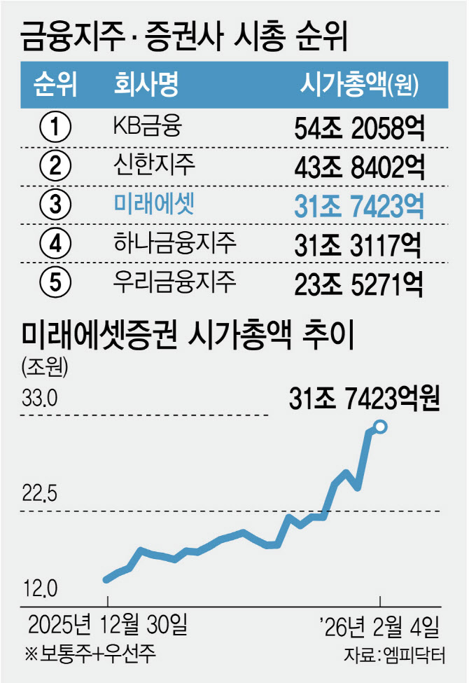 특히 미래에셋증권 시가총액은 금융지주인 우리금융지주(316140)(23조 5271억원)를 넘어 하나금융지주(086790)(31조 3117억원)도 웃돌고 있다.