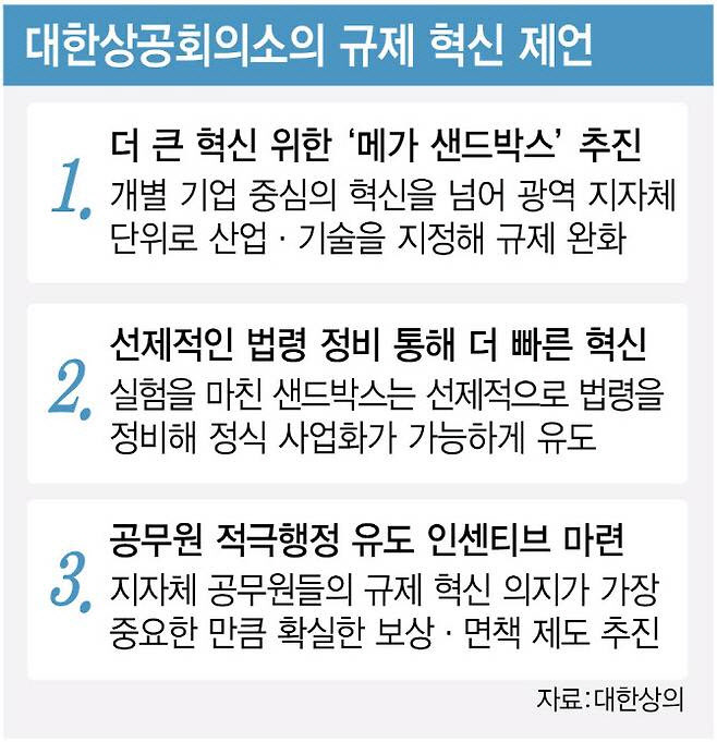 대한상의는 이달 1일 ‘통계로 보는 민간 규제 샌드박스’ 보고서를 통해 ‘메가 샌드박스’를 제안했다. 정부는 규제에 막혀 있는 신사업·신기술을 발굴해 일정 기간 제한적으로나마 허용해주자는 취지에서 2020년 규제 샌드박스 제도를 도입해 5년간 518개사의 신사업·신기술에 규제특례를 내줬다. 이번 ‘메가 샌드박스’ 제안은 여러 제약 아래 특정 기업에 규제특례를 내주는 현 제도에서 한발 더 나아가 비수도권에 지자체 단위로 특정 미래산업과 기술에 대해 포괄적 기술특례와 지원을 주자는 것이다.
