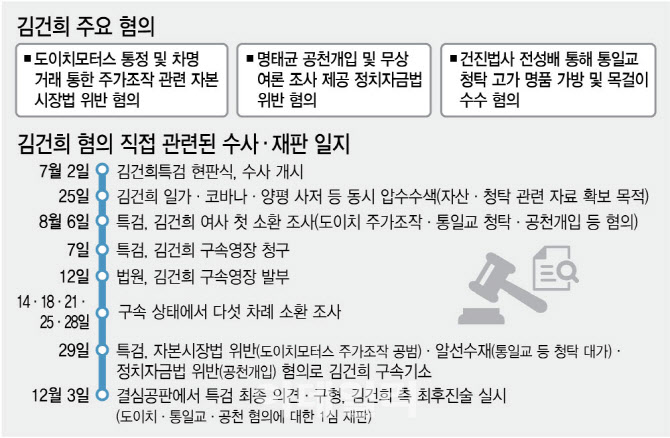 역대 영부인 중 범죄에 연루돼 법정에 선 것은 김 여사가 처음이다. 특검은 크게 세 가지 혐의를 들어 김 여사를 구속기소했다. △도이치모터스 통정·가장매매를 통한 주가조작 △명태균 씨로부터 무상여론조사를 제공 받은 혐의 △통일교 현안 지원을 약속하며 금품을 수수한 혐의다.