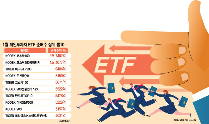 특히 지난 1월에는 이 같은 현상이 정점을 찍었다. 21거래일 중 3일을 제외하고 18거래일 동안 ETF 순매수 규모가 개별주식을 앞질렀다. 매매금액으로 보면 개별주식은 9조650억원어치를 순매도한 반면, ETF는 15조1491억원을 순매수하며 이 기간 월별 최대 매수액을 기록했다.