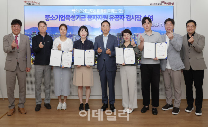 [이데일리 김태형 기자] 조성명(가운데) 강남구청장이 지난 7일 중소기업육성기금 융자지원 업무에 기여한 유공자 4명에게 감사장을 수여하고 기념촬영을 하고 있다.