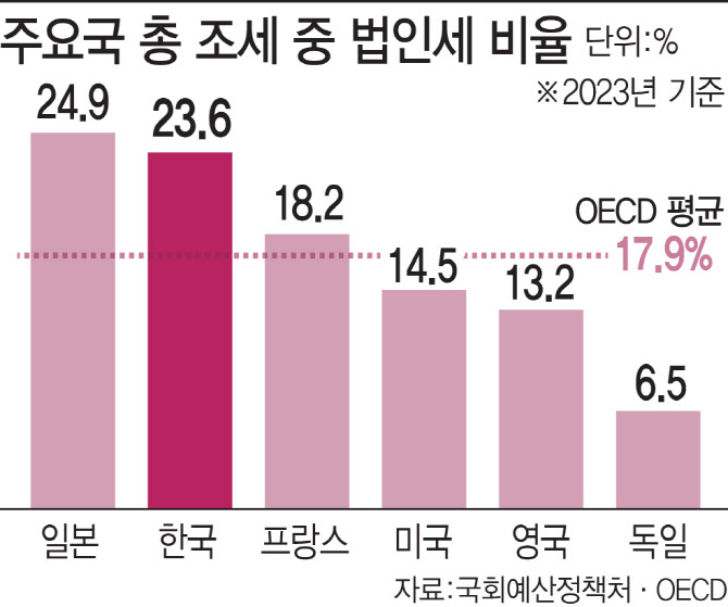 기업들이 내는 법인세는 세입 기반을 확보하고 재정건전성을 제고하는 효과가 있다. 다만 문제는 주요국 산업정책이 ‘국가대항전’ 성격으로 번지며 자국 기업 밀어주기가 심화하는 와중에 한국만 산업계를 옥죄는 정책들이 이어지고 있다는 점이다. 지난 2023년 기준 한국의 총조세 대비 법인세 비중은 23.6%로 OECD 평균(17.9%)보다 높았다. 미국(14.5%), 영국(13.2%), 독일(6.5%) 등 주요국들보다 세 부담이 컸다.