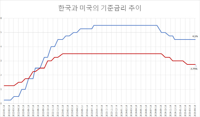 반면 우리나라는 한은이 이번달 금융통화위원회 본회의를 통해 기준금리를 25bp 내릴 것이 유력시 되고 있다. 당초 예상보다 국내 정치 불확실성은 장기화하고 미국 관세정책의 강도는 세지면서 경제성장률이 떨어질 것으로 예상되고 있어서다. 체감 물가 수준은 높지만 물가 상승률 자체는 목표치인 2% 수준으로 유지되고 있고 환율도 최근 급락해 금리 인하를 망설일 이유가 없다고 전문가들은 입을 모았다.