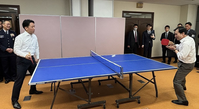 탁구채를 건네받은 두 장관은 곧바로 양복 상의를 벗었다. 안 장관이 넥타이를 풀자 고이즈미 방위상도 웃으며 따라 했고, 안 장관은 셔츠 소매까지 걷어 올리며 진지하게 경기에 임했다.