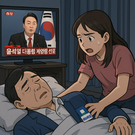 TV를 통해 윤석열 대통령의 계엄령 선포가 알려지자 I 의원 집안 식구들이 난리가 났다. 그의 딸은 안방에서 곤히 자고 있는 I 의원을 깨우러 들어갔다.