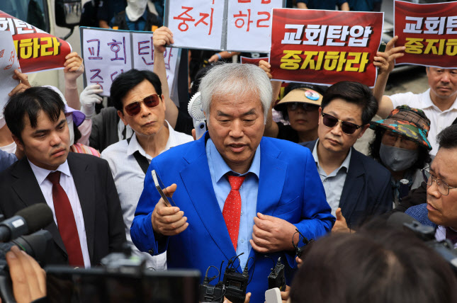 경찰이 올해 1월 발생한 서울서부지법 폭력 난동 사태에 연관됐다는 의혹을 받는 전광훈 목사와 사랑제일교회에 대해 압수수색에 나선 5일 서울 성북구 사랑제일교회에서 나온 전광훈 목사가 발언하고 있다.(사진=연합뉴스)