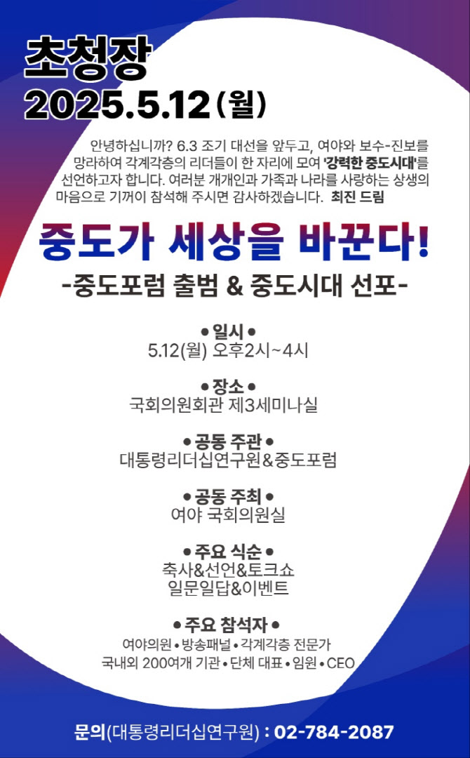 행사는 중도시대 선언문 낭독을 시작으로, 패널 토크쇼, 중도책자 제공, 6.3 대선 이후 중도대통령의 과제와 전망에 대한 논의 등 다양한 프로그램으로 구성될 예정이다. 최 원장은 “중도포럼은 누구나 참여할 수 있는 열린 플랫폼”이라며, 앞으로 중도운동을 범국민적으로 확산시킬 계획이라고 전했다.