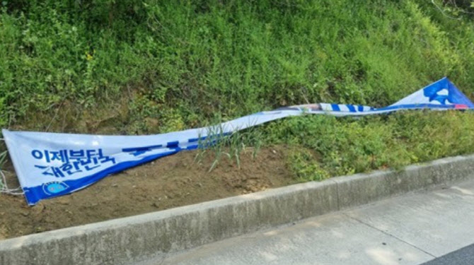 해당 현수막은 끈이 절단 도구나 라이터 등으로 훼손돼 있었던 것으로 전해졌다. 경찰은 현장 인근 CCTV 등을 확인하며 훼손 경위를 조사 중이다.