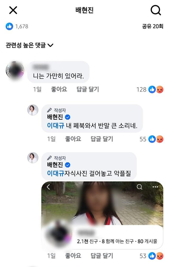 그러자 댓글창에서 네티즌 A씨가 “니는 가만히 있어라”라고 댓글을 달았고, 이에 발끈한 배 의원이 “내 페북와서 반말 큰소리네”라며 “자식 사진 걸어 놓고 악플질”이라고 추가 답글을 달았다.