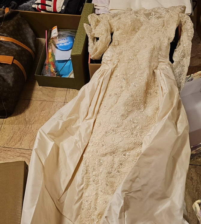 | | 노소영 관장이 6일 공개한 웨딩드레스다. 주변으로 짐 정리 중인 흔적이 보인다. (사진=노소영 인스타그램) |