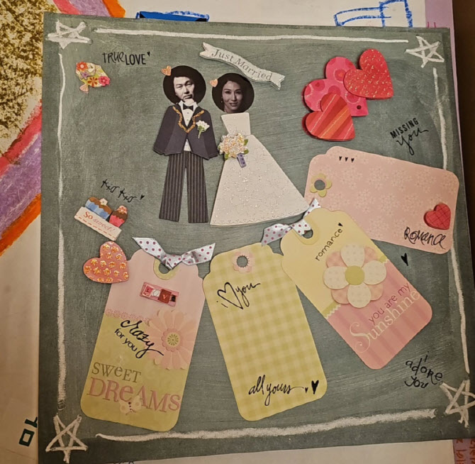 노 관장이 공개한 도화지에는 최 회장과 노 관장의 얼굴 사진 위에 종이로 만든 턱시도와 드레스가 붙어 있다. 또 여러 장의 메시지 카드가 장식돼 있다.