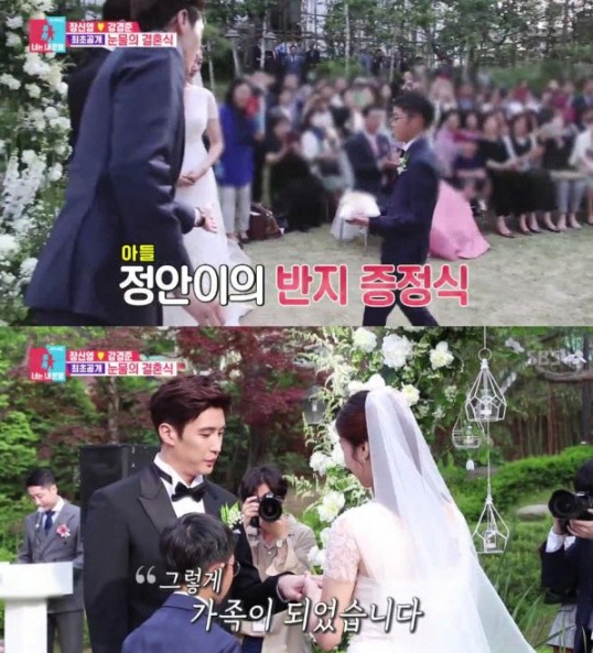 장신영과 강경준은 결혼식 하객들 앞에서 “서로에게 힘든 결정이었다. 금방 끝날 거라는 사람도 있었다”며 “지난 5년 동안 서로의 사랑을 확인했다. 앞으로 서로를 평생 아끼고 소원해지지 않는 셋이 되겠다고 맹세하겠다”고 말했다. 이어 아들 정안 군이 직접 반지를 전해줬다. 스튜디오에서 이 장면을 보던 서장훈은 눈물을 내비쳤다.