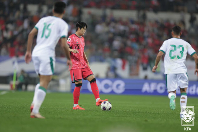 경기 초반 6만 명이 넘는 홈 관중의 응원을 받는 이라크가 강하게 압박했다. 한국은 이라크의 전방 압박에 맞서 최전방 오세훈을 활용한 롱볼로 맞섰다.