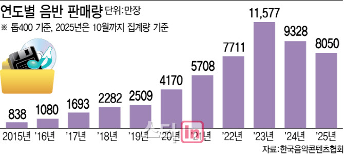 K팝 음반 시장은 코로나19 대유행 시기 팬덤의 소비가 음반에 집중되면서 폭발적인 성장을 기록했고, 2023년에는 사상 처음 ‘연간 1억 장 시대’를 열었다. 하지만 이듬해 음판 판매량은 19.4% 감소하며 9300만 장대에 그쳤고, 올해도 반등하지 못했다.