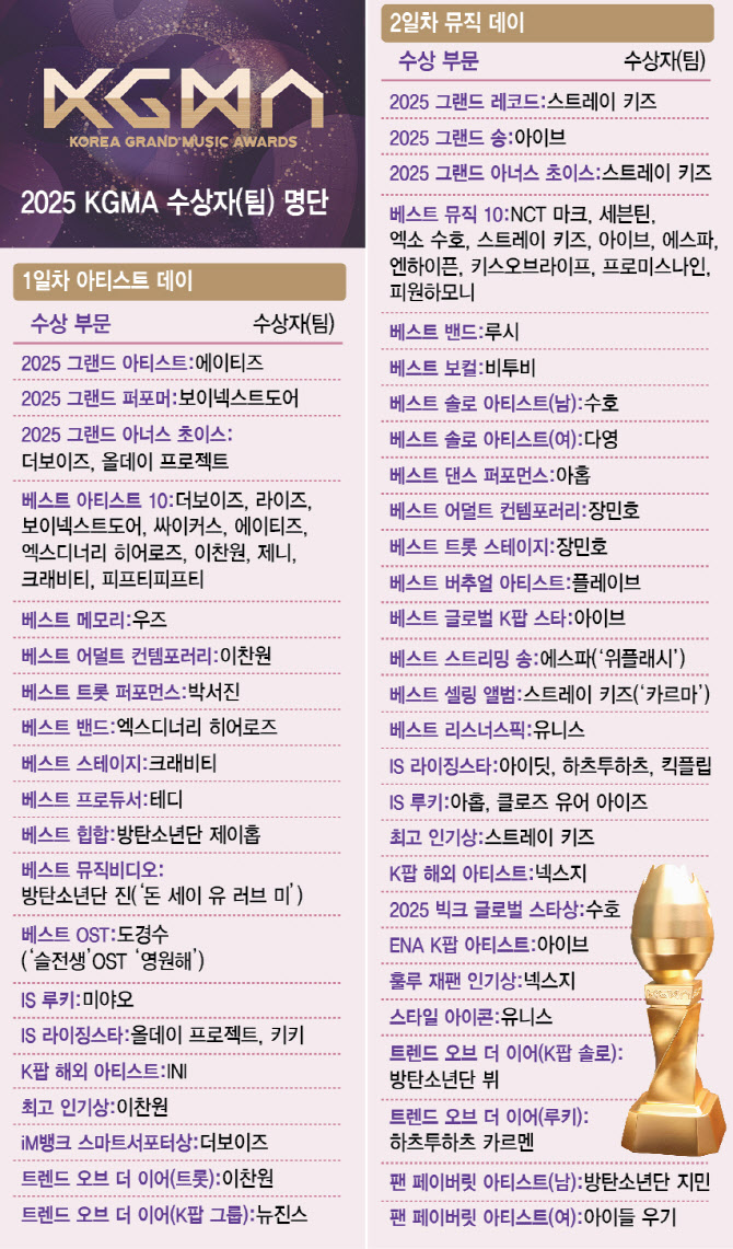 이찬원·장민호 등 트롯 가수도 변함없는 인기올해 시상식에서는 트롯 가수의 활약도 돋보였다. 지난해 5관왕에 올랐던 트롯 가수 이찬원은 ‘2025 KGMA’에서 ‘베스트 어덜트 컨템포러리’, ‘베스트 아티스트 10’, ‘트렌드 오브 더 이어’(트롯), ‘최고 인기상’(아티스트 데이) 등 4개 부문을 수상하며 변함없는 인기를 입증했다. 이찬원은 “가수가 무대에서 빛나는 건 청중이 있기 때문”이라며 “응원해 주는 팬들께 영광을 돌리고 싶다”고 소감을 밝혔다. 트롯 가수 장민호는 ‘베스트 어덜트 컨템포러리’와 ‘베스트 트롯 스테이지’ 2개 부문을 수상했다. 그는 “음악을 정성스럽게 들어주는 팬 덕분에 상을 받은 것 같다”며 “앞으로도 좋은 음악을 들려주겠다”고 포부를 전했다.