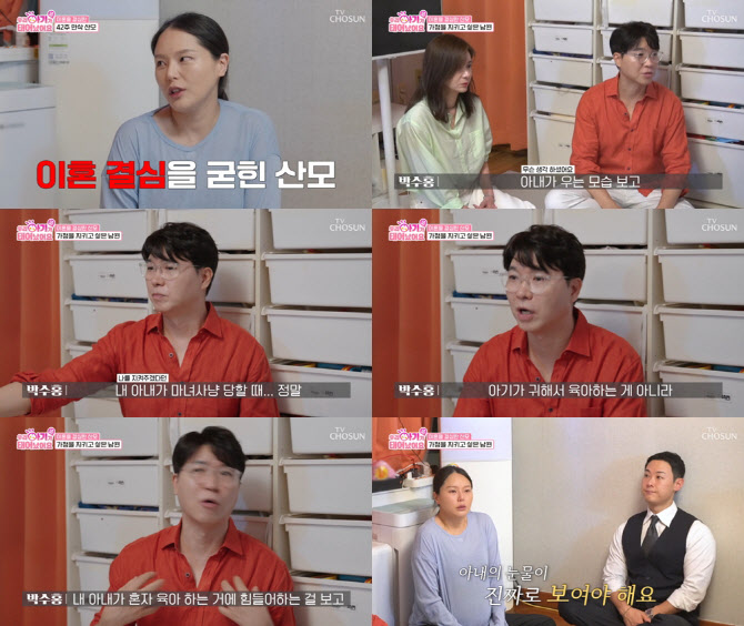 박수홍은 “아기가 너무 귀해서 육아하는 게 아니라 내 아내가 혼자 육아하는 거에 힘들어하는 걸 보면 미안하지 않나”라며 “차 안에서 잠깐이라도 휴대폰이라도 보려다가 집에 올라가야지 하는 게 남편이다. 아내의 눈물이 보여야 한다. 변화해야 할 것 같다”고 조언했다.